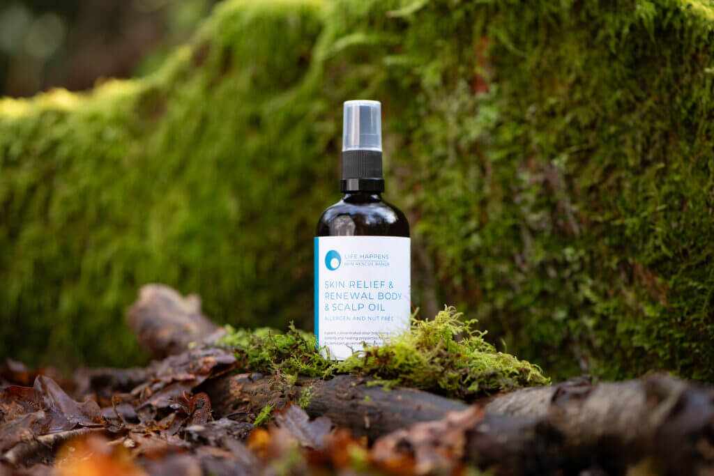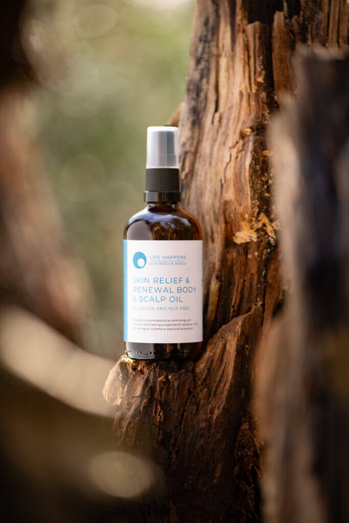 Leave it on for at least 20 minutes as, again, time is needed for it to penetrate. The Skin Relief & Renewal oil has grapeseed oil in it, which helps remove dead cells from the skin’s surface. This is very useful as it aids in cleansing the skin, facilitating better penetration of all the oils as well as protecting it with its antibacterial and antimicrobial properties.
